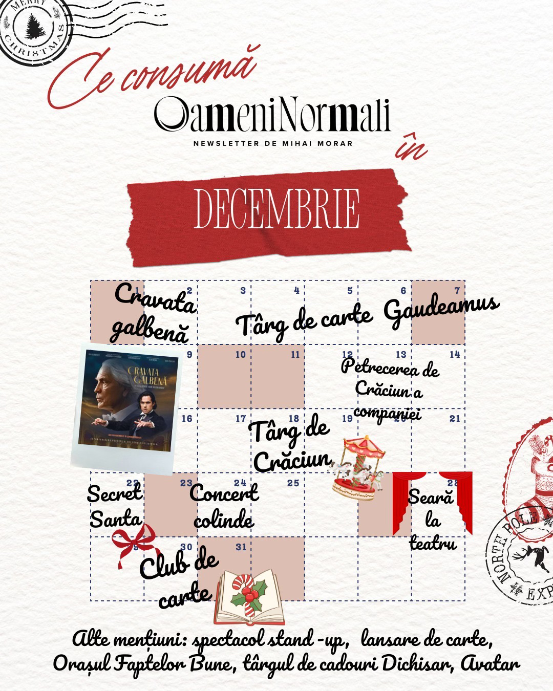 Despre Moș am scris și articolul principal de astăzi. Despre alt Moș. Am plecat de la conversația pe care am avut-o în chat-ul abonaților: Ce consumă offline ”Oameni Normali” în decembrie? Concerte, petreceri, serbări, spectacole, târguri etc. Am pus cele mai frecvente răspunsuri de la voi în acest, să-i zicem, calendar de advent:
